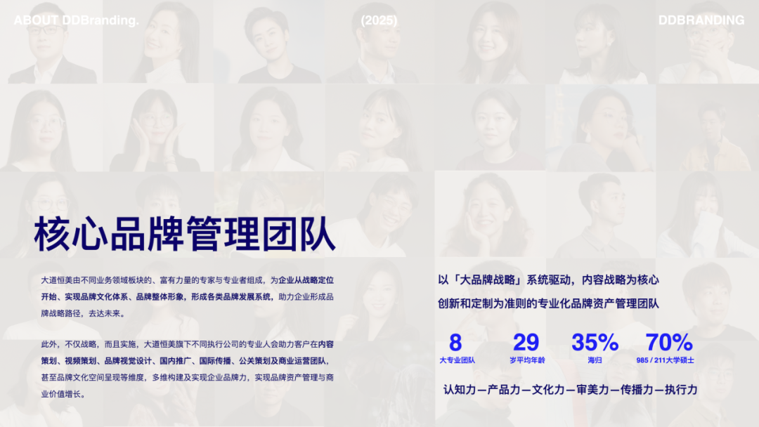 “长期主义,专业系统,卓越服务,信仰奋斗”,今天的大道恒美,已不仅仅是一家品牌咨询公司——她是城市文化的策划者,以“一城一策”激活在地文化的世界表达;是产业升级的推动者,用品牌战略助力中国智造走向价值链顶端;更是时代命题的答卷人,在“高质量发展”与“新质生产力”的国策浪潮中,探索中国品牌的全球范式。