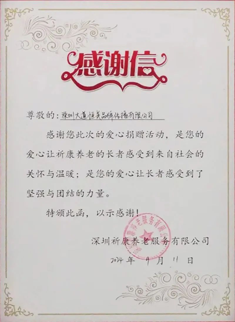 • 关爱民生:2024年8月,大道恒美收到了来自深圳祈康养老服务有限公司的一封感谢信,信中对大道恒美的爱心捐赠善举表示诚挚的感激,致谢大道恒美捐赠资助祈康养老的风雨连廊建设,为长者们筑起了一个遮风挡雨的温暖港湾。