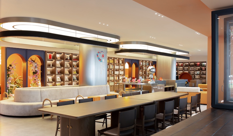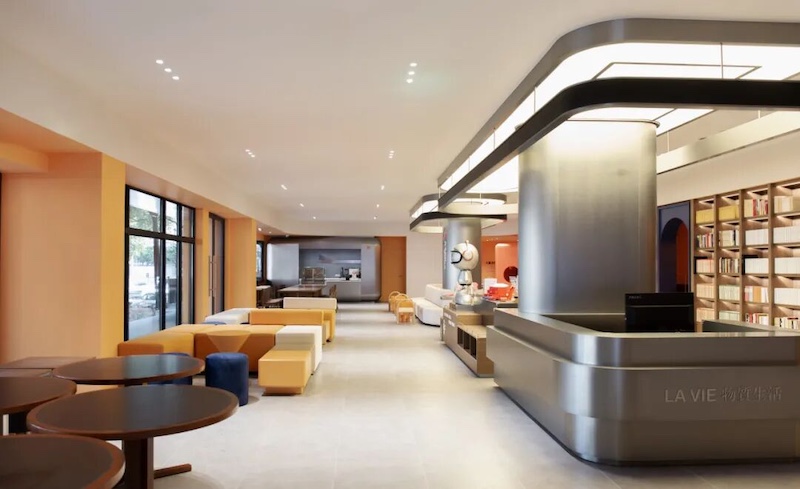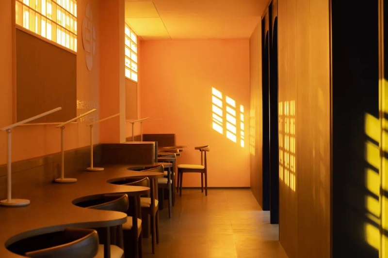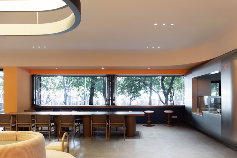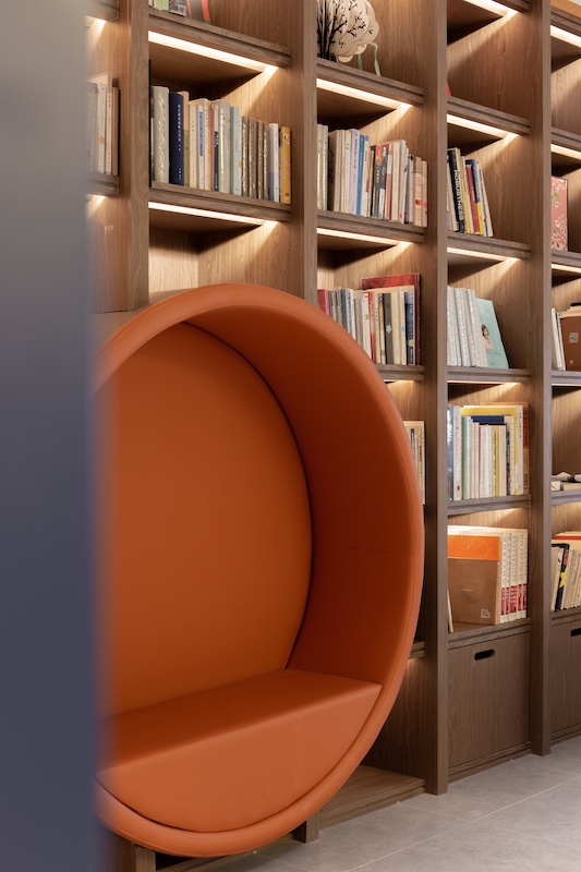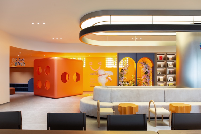 空间以温暖橘黄为主色调,搭配圆润曲线与糖果色 LOGO,将福田IP“福气家族”玩偶、儿童笑脸标识融入装饰体系,构建亲和力视觉语言。家具全采用圆角设计,水吧台高度降至 70cm,书架分层适配儿童取阅习惯,真正以 “一米视角” 实现尺度友好。
