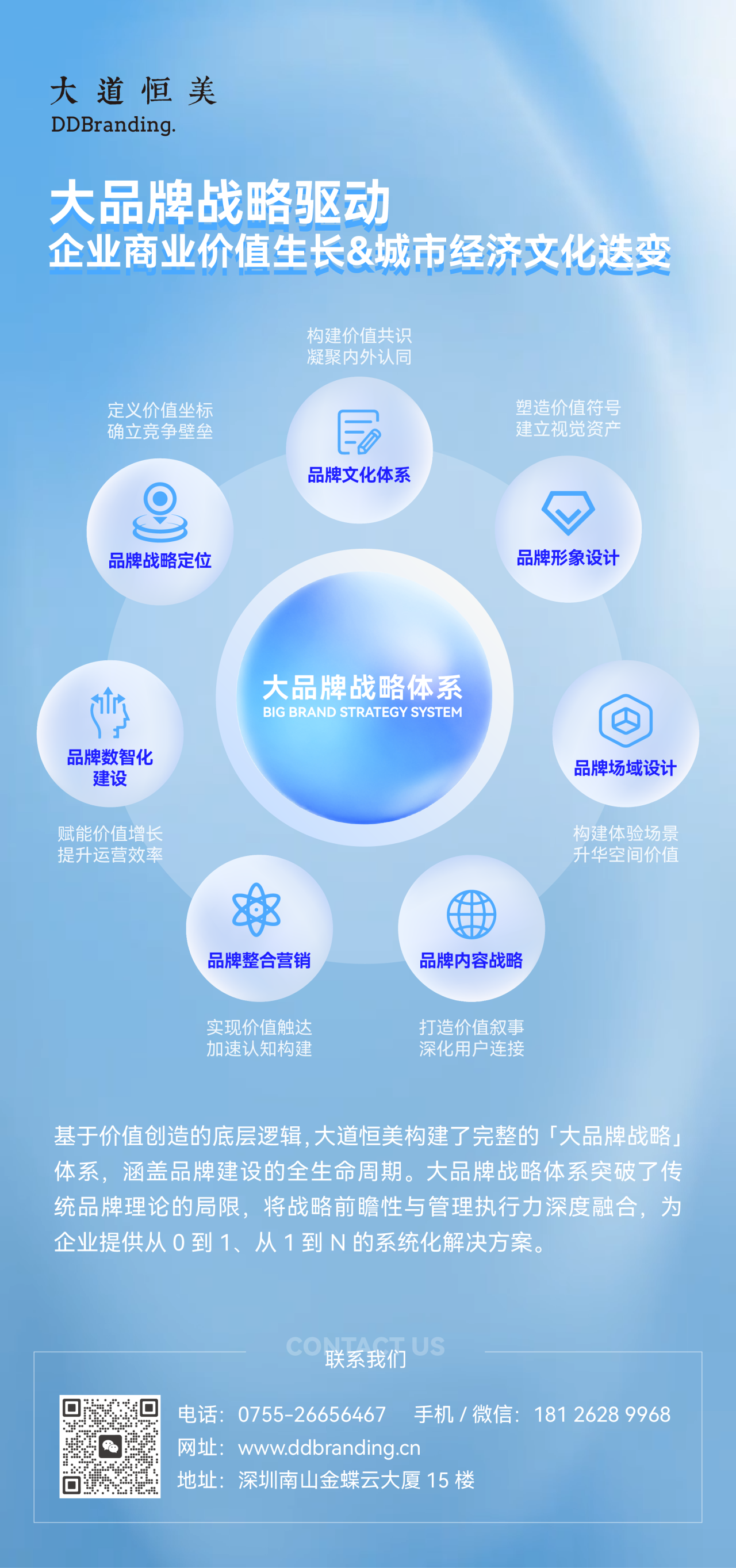 围绕品牌强国战略,大道恒美以前瞻性品牌定位为灵魂,策略性的品牌策划、创意性的品牌设计、整合传播与城市资源能力为内核,服务客户品牌全生命周期,构建客户的卓越品牌形象与可持续发展能力。